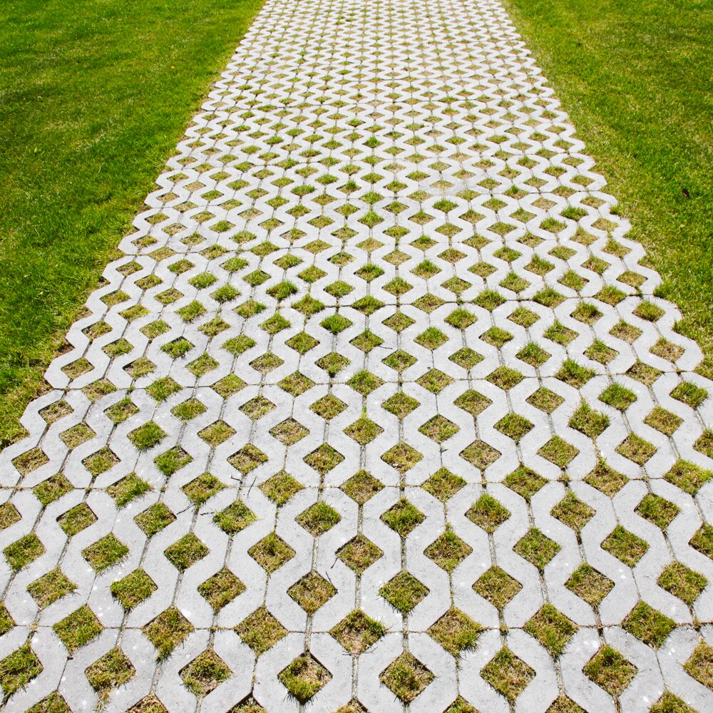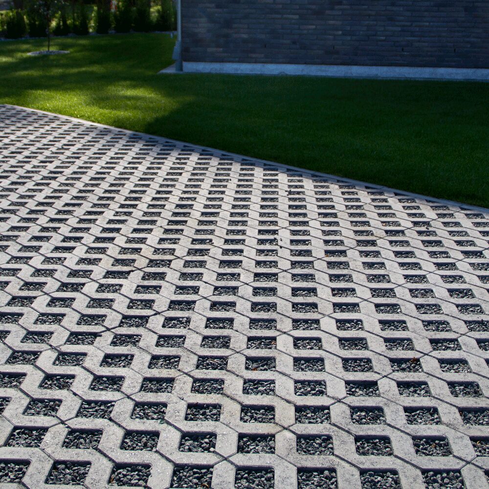 Hægt er að fara með sláttuvélina beint yfir þessar hellur. Tilvalinn lausn til að búa til „ósýnilegt“ aukastæði og einnig sem göngustígur á grasflöt.
